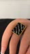 Make a bold statement with this unique rectangular ring. The large face features a striking design with a black background and a scattered pattern of both black and clear crystals, giving it a modern and elegant look. The ring has a thick, sturdy band and a metallic-toned border that flip flops from gold to silver around the face.