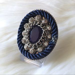 Gorgeous navy blue and silver tone large oval statement ring featuring a faux gemstone surrounded by a metal chain, inset rhinestones and satin rope.