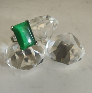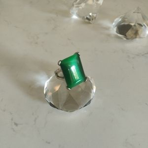 Gorgeous statement ring featuring a rectangular shaped green stone in a silver tone setting. Make a beautiful addition to any outfit.