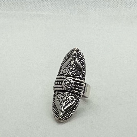Long marquise-shaped design - ring looks two-toned: silver and black. Stylish piece.