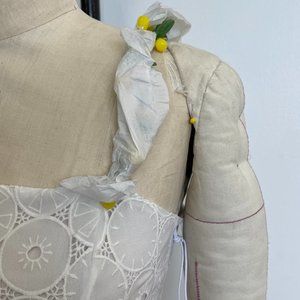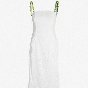 Staud Cocomaya dress in white lace. Perfect for the summer heat! Embellished shoulder straps. Fit is true to size. Concealed zip fastening at back, square neck, sleeveless, all over circle pattern, column silhouette, slit at sides, fully lined.