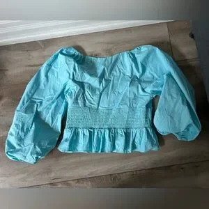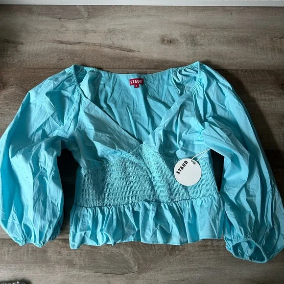 The Staud Matilde Top is a chic, versatile piece made from lightweight, non-stretch poplin with a flattering smocked waistline. It features a deep V-neckline, long balloon sleeves with elastic cuffs, and a peplum silhouette for an elegant yet playful look. The top includes a hidden side zipper for a seamless finish and is crafted from a cotton-spandex blend for a tailored yet comfortable fit. Ideal for elevating casual outfits or complementing dressier occasions