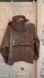Stylish brown shiny jacket with a hood. Features front pockets and button details.
