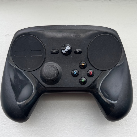 Black wireless controller with dual touchpads and joystick. Features Bluetooth and usb connectivity. Runs on 2 double AA batteries and works with a ton of custom presets from steam perfect for the PC gamer in your life