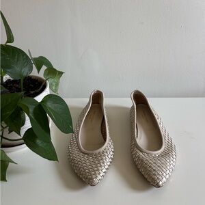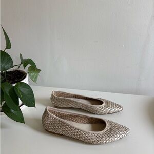 Understated elegance meets retro runway vibes. These Stefano Gamba Italian-made flats feature a sleek pointed toe and a metallic champagne woven leather upper that catches the light in the most subtle, elevated way. The silhouette nods to early 2000s designer minimalism — think clean lines, neutral palette, and effortless sophistication — while the artisanal woven texture channels timeless quiet luxury.