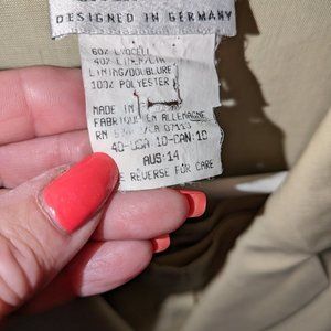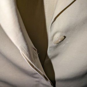 Beautiful very light green 2 piece skirt and jacket short. Linen blend, short sleeve, knee length skirt with zipper and button closure. Hidden button effect on jacket with soft shoulder pads. Freshly dry cleaned