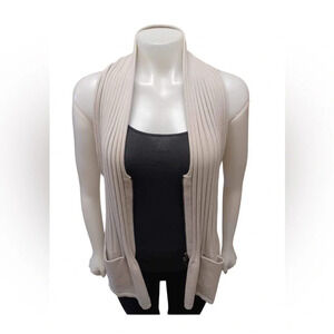 Light grey colour, this unique garmet is sleeveless and zips closed. Has an open top half of the back. The halter has two front pockets and a ribbed bodice. Looks similar to a vest:))