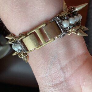 Brass and Pearl bracelet. Small size, with extender. Model has approximately 5 inch wrist circumference and is wearing bracelet with extender. Edgy piece, very different.