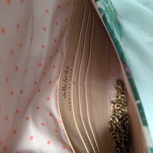 Adorable, summery palm print clutch. The exterior is a beautifully-textured linen blend print. A touch of pink is mixed in with the leafy greens. Small metallic studs on the front flap add some sparkle. Interior material is ADORABLE blush pink polka dots with 6 card slots in the interior and enough room for your essentials.