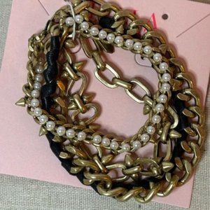 A gorgeous statement maker! This antique gold finished triple wrap bracelet triple wrap features a unique mixed media fabrication - link chain with black fabric thread, studded link and pearl chain. This piece is the epitome of versatility - can be worn as a wrap bracelet or necklace!