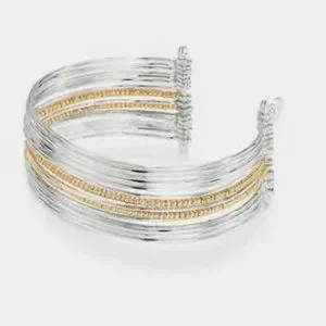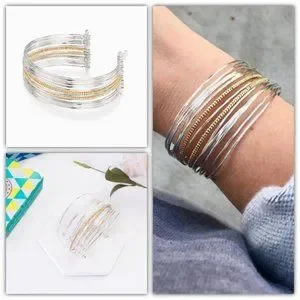 This beauty looks like multiple bangles with the ease of a cuff! Shiny silver mixed with semi shiny gold beads is an instant arm party all in one style.
