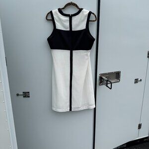 Modern and sophisticated, this sleeveless dress from Stella & Jamie features a textured white knit front with sleek black panel accents. It has a structured silhouette with a back zip closure and subtle stretch, perfect for a polished daytime look or dressed-up evening event.