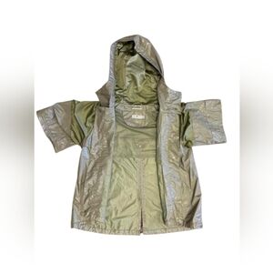 Sage green rain jacket button up hooded with a draw string draw string on hem of waist slight high low for bum coverage VERY oversized half over sized sleeve 3 button sizing on cuff back buttoned up vent button up hood 4 pocket design mesh liner drop shoulder*fall/winter 08 collection*