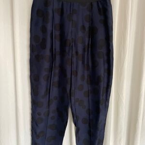 High waisted silk blend (59% rayon & 41% silk) tuxedo pants by Stella McCartney. Patterned with large dots in black on blue fabric, ankle length, side zipper, front box pleats and stretchy tuxedo band across the front. Extremely flattering and versatile. Looks amazing dressed up and just as good dressed down. Size 40. Fits true to size. They no longer fit, otherwise I would keep them :)