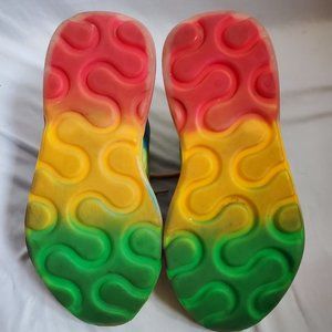 neoprene, coated fabric, suede effect, logo, multicolour pattern, laces, round toeline, wedge heel, rubber cleated sole, fully lined, large sized.