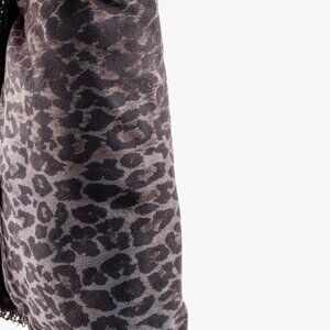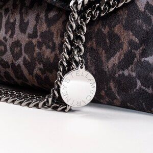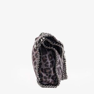 A grey and brown leopard-print shoulder bag with a relaxed silhouette from Stella McCartney featuring braided black leather and silver-tone diamond-cut chain detailing, two chain top handles, a circular logo charm, a matching chain shoulder strap, and a magnetic snap-closure at the top that opens to a spacious, monogrammed interior that contains a zip-fastened pocket.