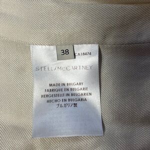 This is an ivory Stella McCartney "Fur Free Fur" coat. It hits above the knee and has snap closures.