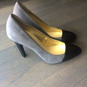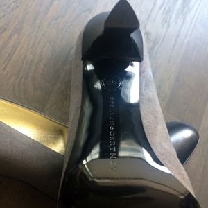 Grey suede, black leather cap toe and heal, shiny black sole, gold and cream color leather inner sole.