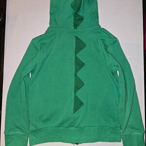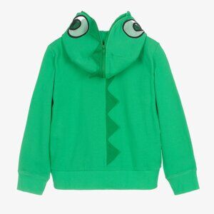 Teen boys green zip-up hoodie by Stella McCartney Kids, featuring a playful crocodile design on the hood. Crafted from soft, mid-weight organic cotton jersey, this unique hoodie includes zippered front pockets, ribbed cuffs with thumb holes, and cool 3D spikes along the back. The hood can zip up completely to form a fun mask look.