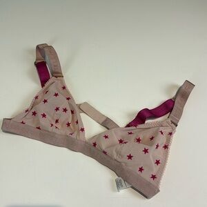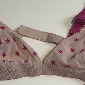 Semi-sheer nylon tulle bra in light pink with stars. Tonal flocked graphic pattern at cups. Tonal logo pattern at elasticized shoulder straps and rib knit hem. Adjustable hook-eye fastening at back. Gold-tone hardware. Tonal stitching.Made from cruelty-free, non-animal materials.