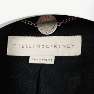 This blazer from Stella McCartney's 2012 Pre-Fall and Winter collection is crafted in a thick black viscose crepe, and features long sleeves, vented cuffs with hidden button closures, padded shoulders, a notched lapel collar, front button closures, front patch pockets, a back vent, and is lined in a tonal satin.