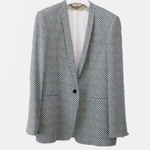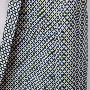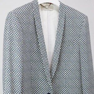 An oversized single-button blazer from Stella McCartney's 2012 Spring and Summer runway collection in a navy, cream, and yellow geometric diamond-printed unstructured slinky stretch fabric, featuring narrow shawl lapels, and two front jetted mock pockets