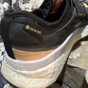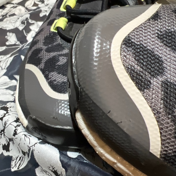 Excellent condition Stella McCartney running shoes in black Cheetah print with green accents. Goretex inner/outer shell with cushioning around ankles for added support. Adjustable bungee cord lace ups in front with Velcro top strap. Bottom treads in great