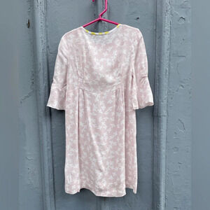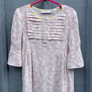 Delicate and pretty Stella McCartney kids crepe dress. Pink with bird print, bell sleeves, tuxedo ruffled front.