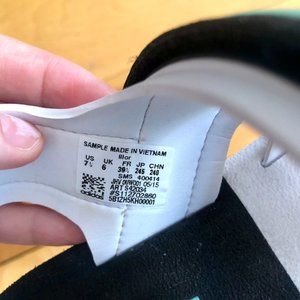 Black and white sandals with small turquoise details. Velcro closures and foam sole.