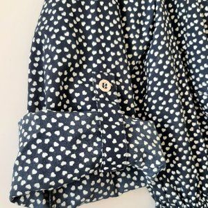 A sweet blouse featuring mini white hearts on navy blue. 1/4 zip front, tie waist, buttons on sleeve for easy roll up/cuffing and two front pockets. Perfect with your favourite pair of denim or trousers! 100% polyester