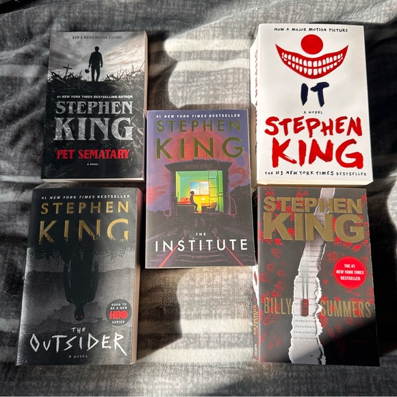Set of five Stephen King novels. Includes 'Pet Sematary', 'The Institute', 'The Outsider', 'Billy Summers', and 'IT'. Perfect for horror and thriller fans. Clean pages, no writing or damages.