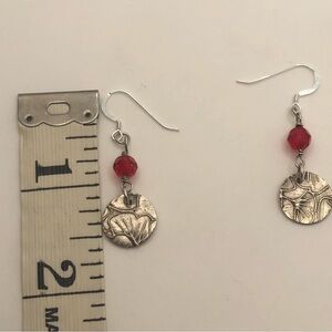 Sterling silver hook earrings with 999 silver flower petal design coin & red crystal accetn earrings.