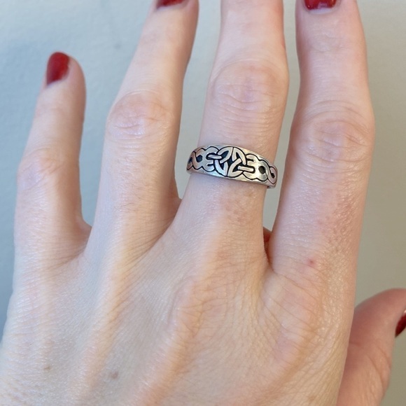 Beautiful Sterling Silver Ring with Tribal style accents. Stamped 925. Has been polished with a silver cloth. Cute boho style ring. Excellent condition!