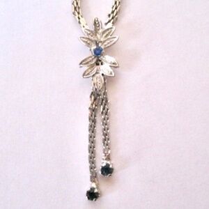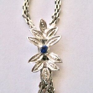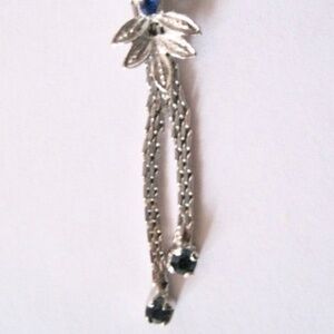 Flower shape pendent has one tiny blue stone and tassels each have a tiny blue stone