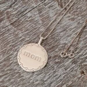 Beautifuth Mother Gift. 18 inch Box Chain necklace with 5/8 inch Mom pendant. Both marked 925. Enough room on the front or back for engraving a short message or adding a name