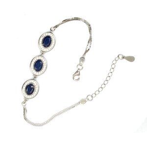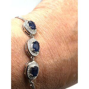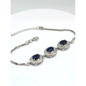 Beautiful sterling silver 925 bracelet featuring three deep blue genuine sapphires, each surrounded by a halo of sparkling white sapphires. The elegant design has an adjustable box chain for a perfect fit, finished with a secure lobster clasp. Both the blue and white stones are faceted for brilliance. Stamped 925. Excellent condition, with a modern, timeless style that layers beautifully or shines on its own.