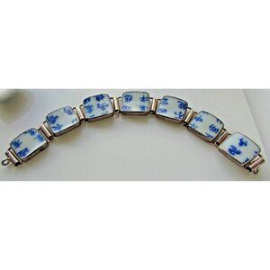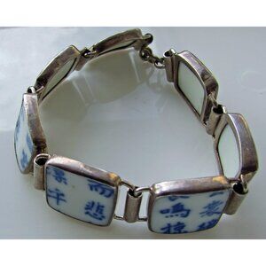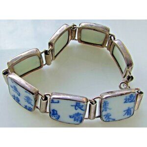 Sterling Silver Blue Willow Chinese Characters Tile Bracelet Link Panel 7 "