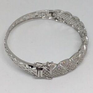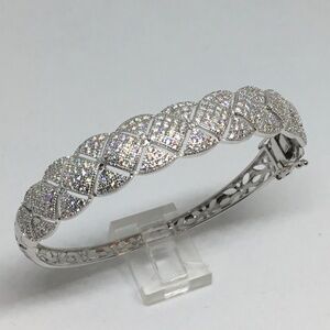 Sterling Silver Hinged Bangle Bracelet with safety clasp. Stones are lab created CZ. Fits up to size 7" wrist.