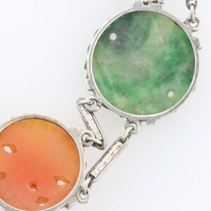 Sterling Silver Carved Floral Red Jadeite & Jade Hinged Bar Link Bracelet - 7.5"