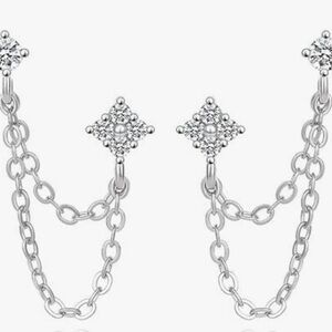 Elegant sterling silver double chain earrings featuring rhinestone accents, for double hole piercings. Perfect for any occasion. Brand new, in original packaging.