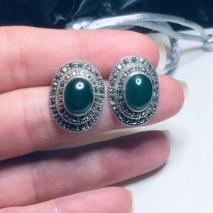Sterling Silver Genuine Green Agate & Marcasite Earrings