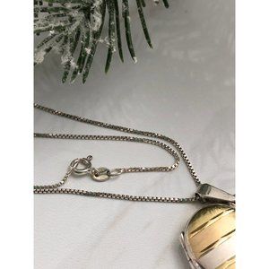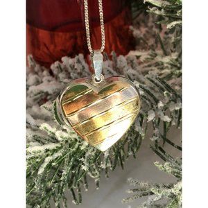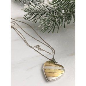 Heart Shaped Sterling Silver Locket necklace in tones of Gold, Rose Gold and Silver.Has etching between each colour tone. Locket measures 1 1/4" in height by 1 1/8" width. Sterling silver box chain is 24" in length with a spring closure. Locket weight with bale: 9.25 gm. In very good condition, snap closure works well. No returns or exchanges.