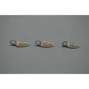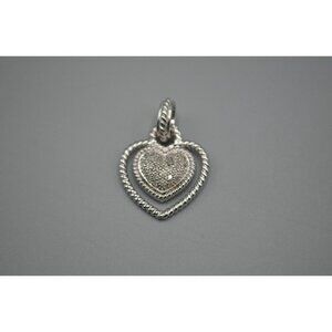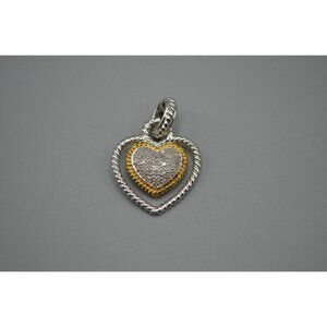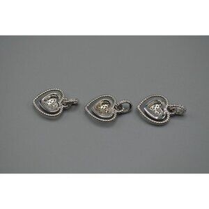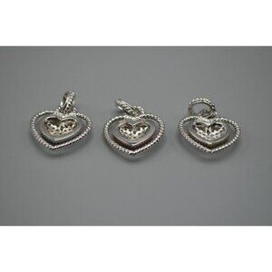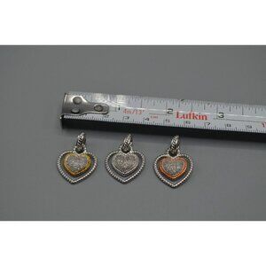 Set of 3 sterling silver heart pendants with clear cubic zirconia accents. Each one has a different metal color surrounding the inner heart: bronze, silver, and gold tones. They're stamped 925 JS and in total they weigh 9.95g together. Each measures 1". In excellent condition, please review photos closely.