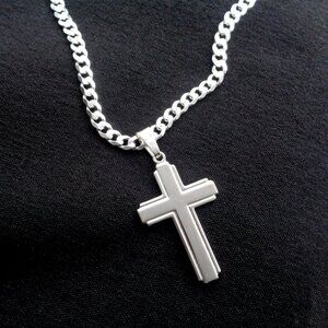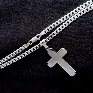 Sterling Silver Large Christian Cross Pendant with Curb Chain Stamped 925 Italy