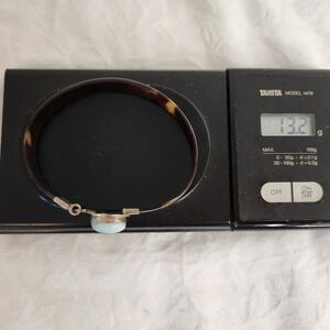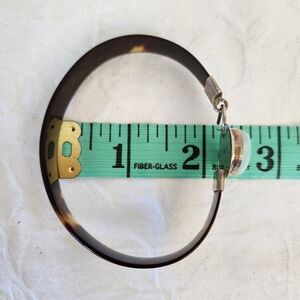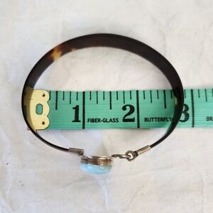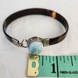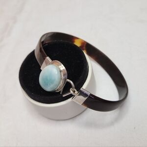 Vintage 60s to 70s Solid 925 Silver Bezzle Set Large Authentic Watery Blue Genuine Larimar polished Cabochon Bracelet with Caramel Brown Tortoise Shell Cuff and Silver tension Clasp.