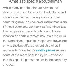 *there will be no new Larimar found in the world, due to its high demand prices have skyrocketed and there are a number of imitations produced from glass, Agonite or dyed Quartz, buyers Beware!