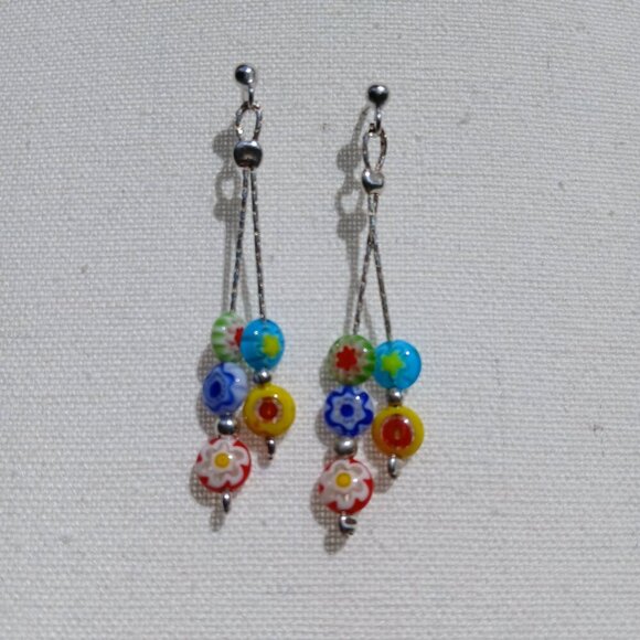 Sterling Silver Millefiori Dangle Drop Earrings Multicolour