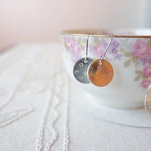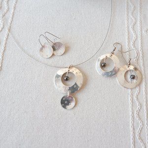 - Earrings: two pairs, both with fish hooks. First pair is a simple silver hammered disc, second pair is a hollowed disc with dangling dark grey beads.