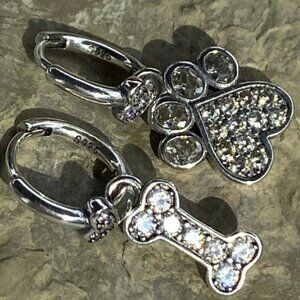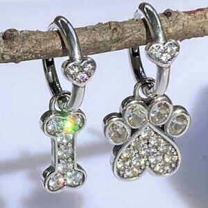Sterling Silver Paw Print and Bone with Cubic Zirconia Stones Earrings