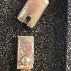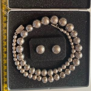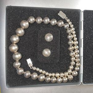 A gorgeous Sterling Silver Pearl Necklace with matching Ear rings. Very 70s Vintage and in excellent condition. The Necklace features 55 Pearls and weights 84g . It is 21" long ( 63.5cm) Earrings are 1/2 Pearls with a weight of 6g and are 1/2" wide and 1/4" thick. Comes is a nice solid Aluminum Metal case with a foam lining.